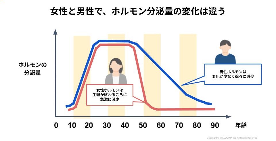 更年期は40〜50代の女性が必ず通る、生理的なホルモン変化の時期。同時に、仕事・家庭・介護など人生のライフステージに変化が起こる年代でもあるため、身体だけでなく心や社会生活にも影響が大きいといわれています。男性にも更年期がありますが、ホルモンの分泌量が男性はゆっくり減少していくのに対し、女性は急激に減少するため、様々な症状が出やすいという違いがあります。 公益社団法人 女性の健康とメノポーズ協会が日本放送協会(NHK)と特定非営利活動法人POSSEとの共同企画により2021年7月に実施した「更年期と仕事に関する調査」によると、40歳から54歳までのすべての年齢群において、7割以上が更年期症状による辛さ・日常生活への深刻度が中程度「3」以上であるにも関わらず、職場で問題を抱えたときに「誰にも相談していない」という人が60.8%にものぼっていることが明らかになっています。