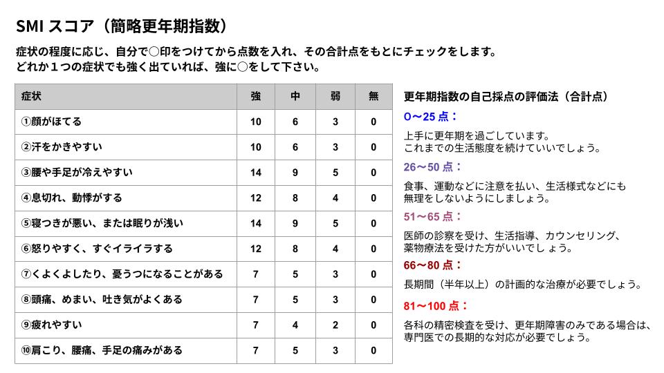 更年期症状というと、顔がほてるホットフラッシュやイライラする・怒りっぽくなる神経症状を思い浮かべる方が多いかもしれません。でも実は、更年期の症状は数十種類から100種類以上あるとされており、症状の現れ方は個人差が大きく、日常生活に支障が出る場合は「更年期障害」と呼ばれます。更年期症状の重症度をみる方法はいくつかありますが、気になる方は更年期指数を簡単にチェックできる「SMIスコア」でセルフチェックしてみましょう。