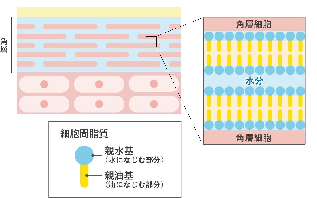 セラミドとは、肌のもっとも外側にある角質層の細胞間脂質の主成分。角層のすき間を埋める「接着剤」のような役割をもち、水分を抱え込んで肌のうるおいを保ち、外部刺激から肌を守る「バリア機能」に不可欠です。