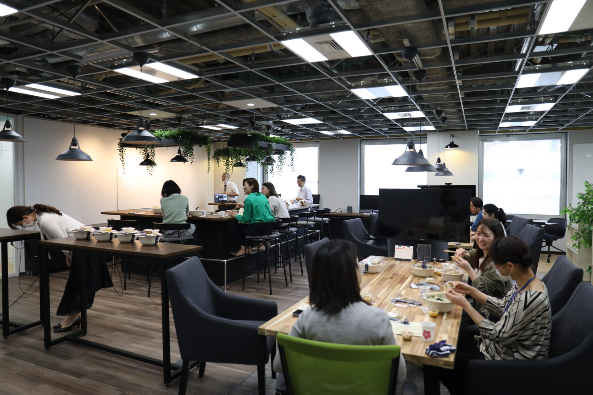 そこで2022年1月、社員の変革マインド醸成のために現オフィス(新宿区飯田橋)への移転が決定。社長室と島型対向式レイアウトを廃止し、フリーアドレス制を導入。共用ラウンジエリアも設け、場所を選ばずシームレスなコミュニケーションができるようになりました。