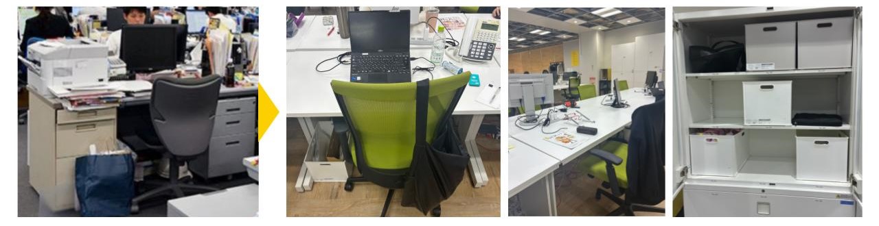 本社移転前の営業担当者のデスク(写真左)もDX推進、フリーアドレス導入後にはこのとおり(写真右)!
