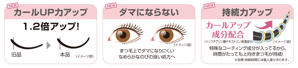 アイラッシュカーラーいらず!カールアップ成分を配合。従来品よりもまつ毛を上向きにキープします。