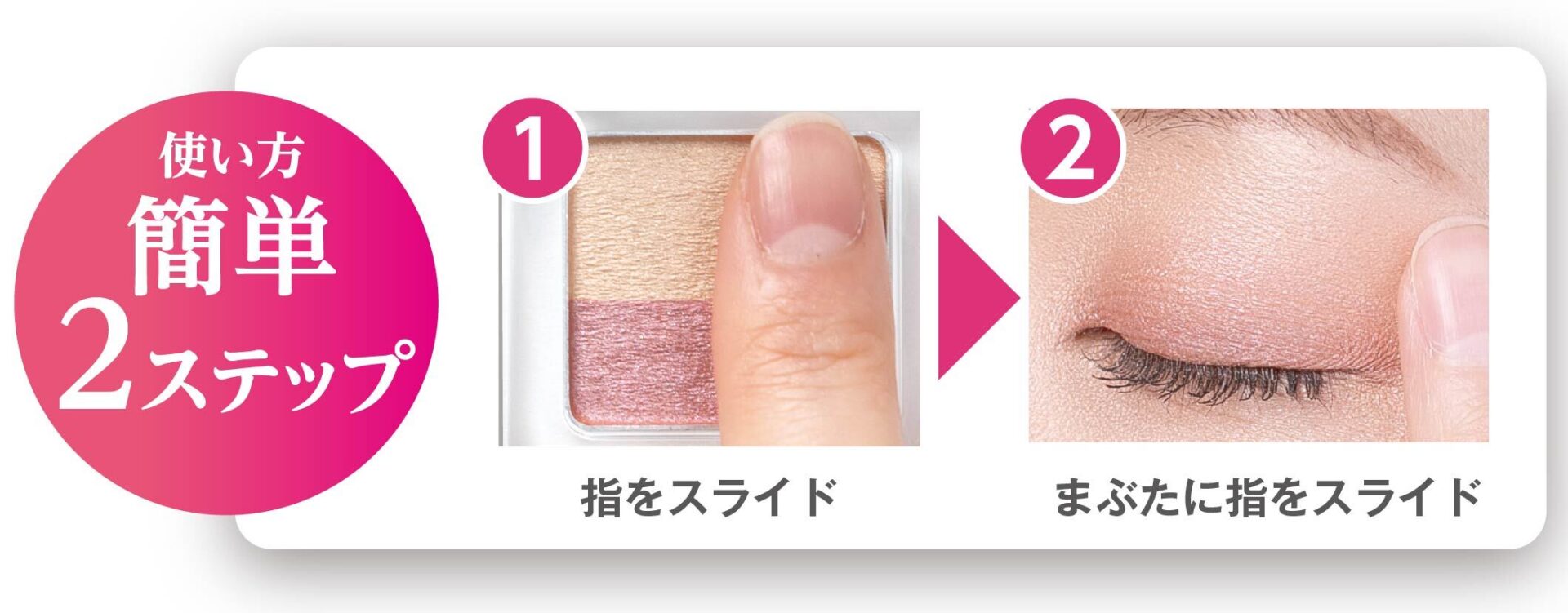 アイシャドウの上に指をスライドさせて、そのまままぶたの上でスライドしてなじませるだけで、あっという間にグラデーションが完成。 メイクが苦手な人、メイク初心者の方、忙しい方にも!