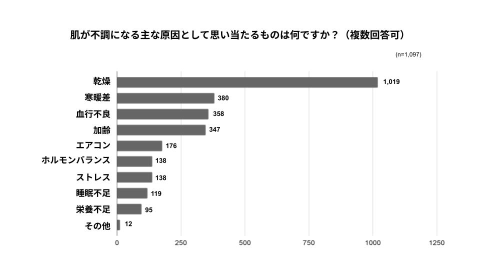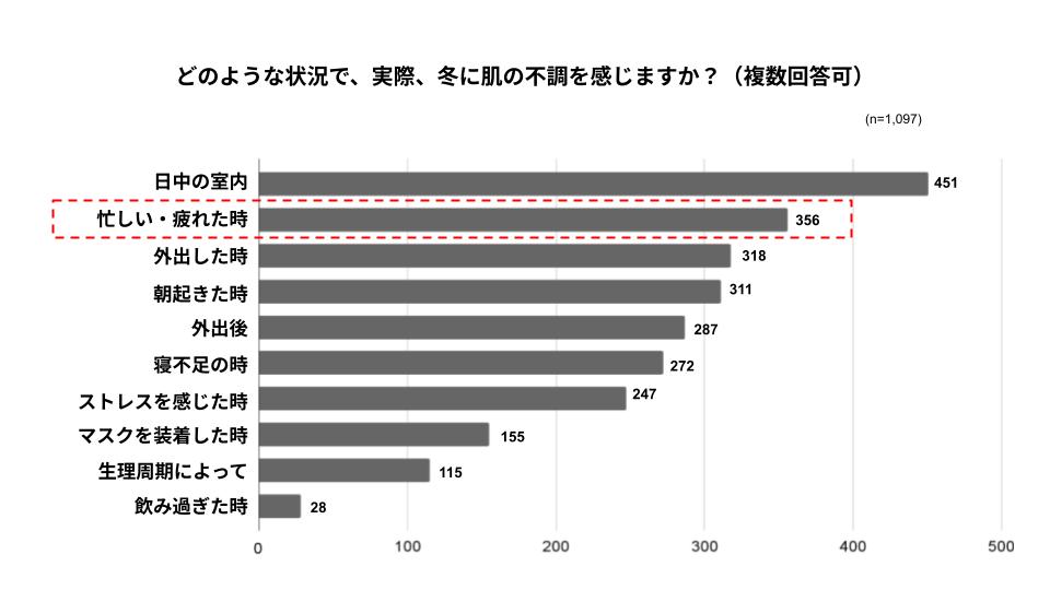 しかし、「肌の不調を感じる状況」についての質問では、約41%に該当する451名が「日中の室内」と回答する一方で、約32%が「忙しい・疲れた時」と回答しており、今回の調査では、冬の肌不調には、乾燥などの外的要因だけでなく、ストレスや疲労といった内的要因も大きく影響していることが分かりました。